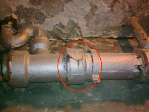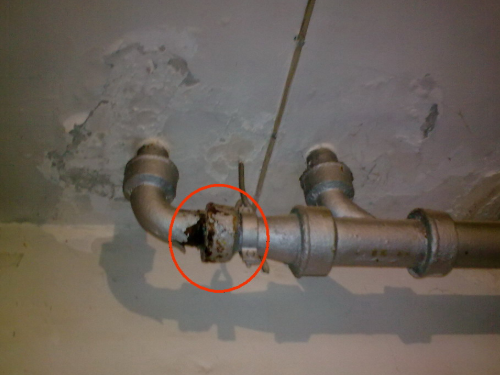 3、先把鑄鐵管拿鑄鐵焊條改成立式朝向下水,接著在后接管件頂端預置一個接頭,再把自家下水的PVC管接到接頭里面,把此接頭朝著自家下水的窟窿,之后在鑄鐵接頭內,PVC管周遭打上防水膩子,最后抹上防水膠即可。
